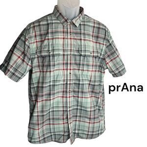 prAna Shirt Button up Men's Tower Grey Maroon Plaid S/S Wove Large