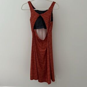 In excellent preowned condition. Built-in shelf bra, comfortable stretch fabric, and stylish open back make this a great dress for light activity and everyday wear.