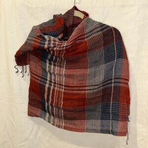 prana rusty red blue tartan plaid wool modal fringe trim shawl wrap scarf
