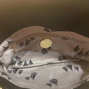 Pretty Ships multicolor cotton vacation clutch with gold detachable chain. Gold sequin embellishments and inside zip pocket. Cute, clean, fun bag to carry with you where your travels take you.