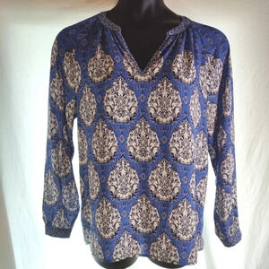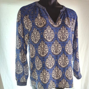 Pretty Blue Fancy Print Blouse with long sleeves, gentle shoulder pleating and a bright lovely design.