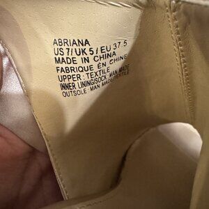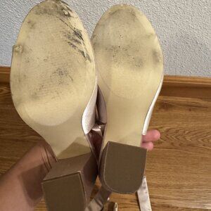 Just Fab! heels in US size 7. cream colored with rose gold tint. very reflective. almost new. worn once for a bridesmaid. has ties to tie in bow around lower leg.