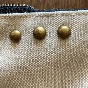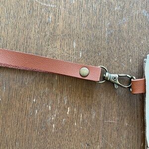 cute, lightweight wristlet from pretty simple. tan and brown with fun metal stud details. brand new! leather clutch strap with hook closure.
