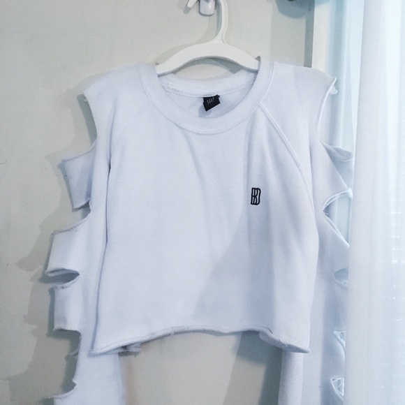 white cropped Blvckdope pullover with ripped sleeves