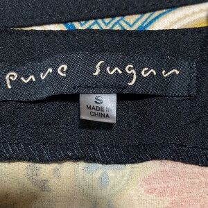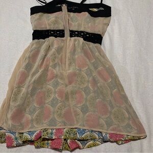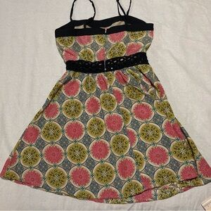 Adorable and colorful mini dress from pure sugar is a perfect summer go-to. Vibrant medallions of pink and avocado green against a blue lattice backdrop with a black lace cut out waist. Adjustable straps. Fully lined with black trim.
