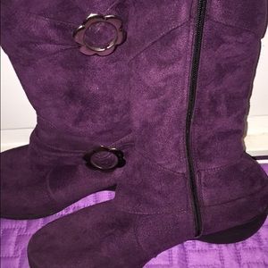 Purple long boots ! flower decorations on the outside and zipper on inside .