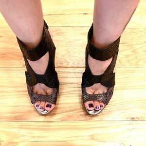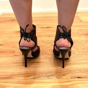 - unique "cage" design features a continuous strap in the front over the ankle, with a lace up corset in the back