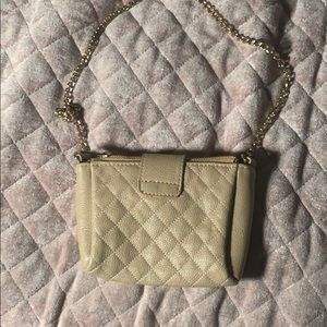 this cute tan purse has diamond patterns on the front and back. also has a lock and chain straps. has lots of room. and has a paint spot but can be removed. READY TO SELL!!