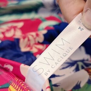 Colorful swimwear with bold floral patterns. Features pink, blue, and green shades. Ideal for beach days.