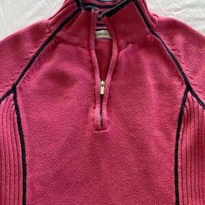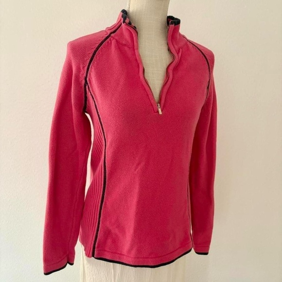 pink with navy stitched knit quarter zip long sleeve sweater.