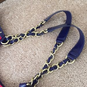@caribbeanbeauli it's bright red and navy with gold chain. I added another picture if that helps!
