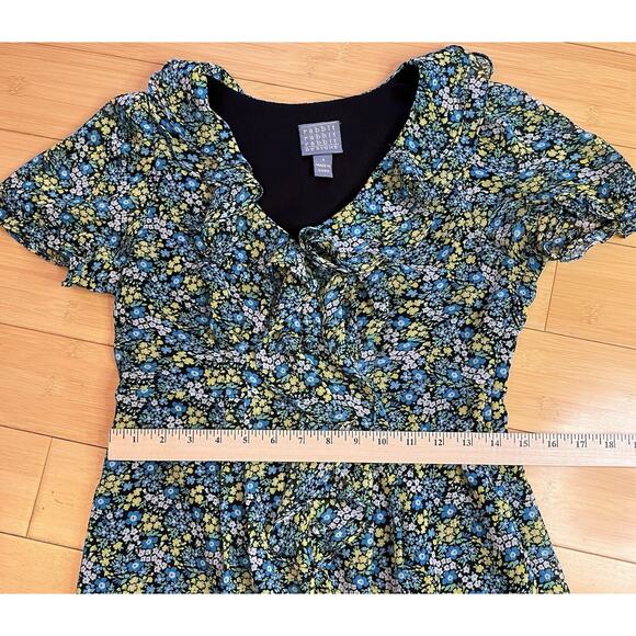 This rabbit rabbit DESIGNS dress is a stunning addition to any wardrobe. The blue floral pattern and colorful accents make it a perfect choice for summer, spring, or fall. The dress features a V-neckline, short puff sleeves, and an empire waist for a flattering fit and flare style. Size 4