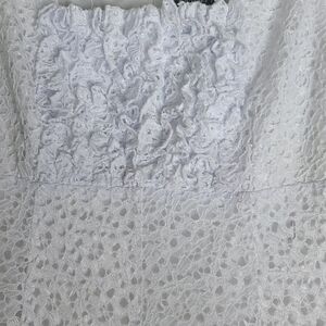 Lovely pre-owned white lace dress with sleeveless design and intricate details at the top.