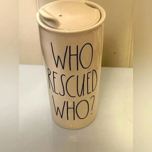 rae dunn who rescued who ceramic coffee hot beverage mug cup with lid animal lovers/pet rescue