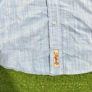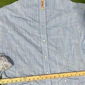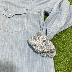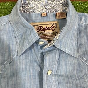 The Rafter C pearl snap shirt in size medium features a baby blue color with a Western theme, making it a stylish addition to any man's wardrobe. This button-up shirt has long sleeves and a snap closure for a unique and fashionable look. Perfect for casual occasions or dressed up with a jacket, this shirt is versatile and on-trend.