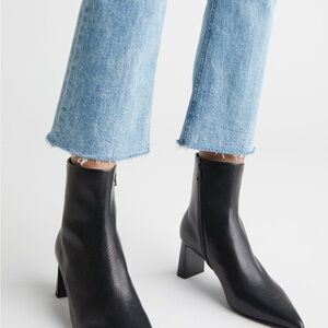 Sleek black ankle boots. Pointed toe design. Chunky heel.