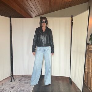 Sleek black leather jacket. Classic design. Perfect for layering. I love this jacket but it fits a little large. I’ve only worn it once and is sitting in my closet so…