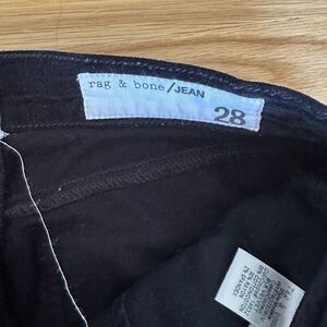 Sleek and versatile black jeans by rag & bone, featuring zippered ankles for a modern edge. These slim-fit jeans are crafted from a soft, stretchy blend of cotton, rayon, and spandex for all-day comfort.
