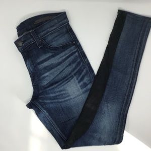 Stylish skinny jeans by rag & bone. Features a blue denim front with black lambskin jodhpur side panels. Perfect for a chic, modern look.