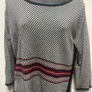 Chic crew neck sweater with diagonal black and white stripes. Reddish accents add a stylish touch. Ideal for everyday wear.
