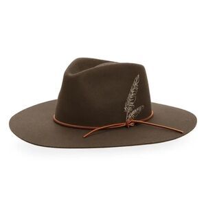 This classic wool fedora is adorned with a stitched feather design, leather band and branded rivet.