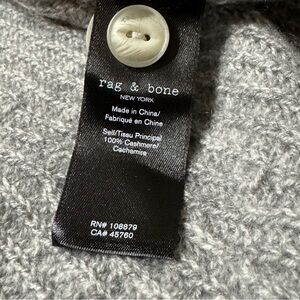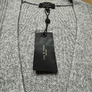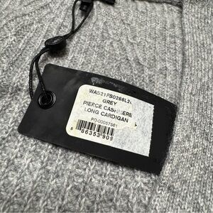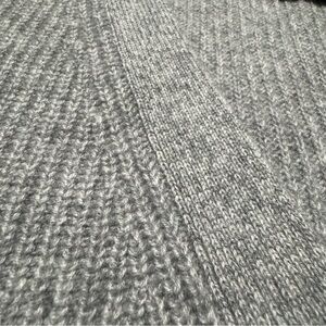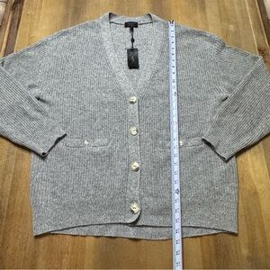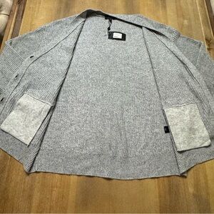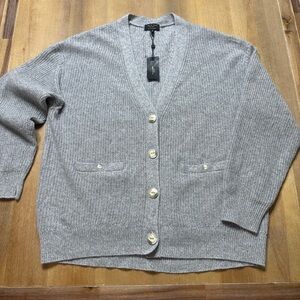 Soft light gray cardigan with button front. Features ribbed knit and side pockets. Ideal for layering.