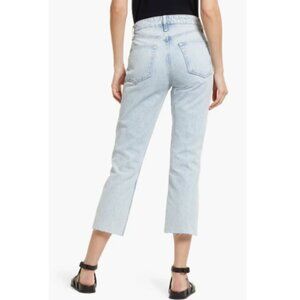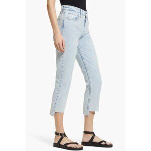 5-pocket styling. High rise. High-low length cropped ankle with raw trim.