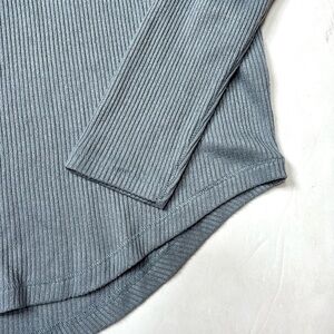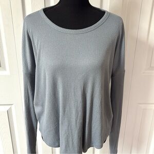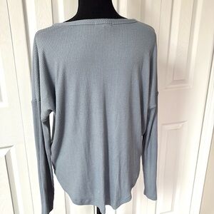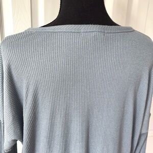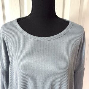 Ribbed knit - blue with a slight sheen to it - super soft- Elevate your wardrobe with this stylish light blue long sleeve top. Perfect for any occasion, this top offers both comfort and elegance.