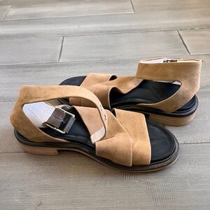 A knurled roller buckle gives signature attitude to this supple Italian-leather strappy sandal with a comfortable cushioned footbed. Wrap-Around Straps & Buckle Closure at Ankles.