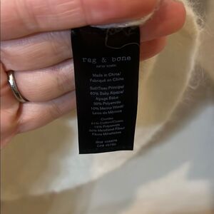 This rag & bone sweater features a classic crew neck design and long sleeves, crafted from a soft and slightly fuzzy knit fabric. The sweater is primarily white, offering a versatile look that can be dressed up or down.
