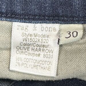 Upgrade your wardrobe with these rag & bone Women's Olive Harrow Mid-Rise Skinny Jeans in a dark blue color. Made in the USA, these size 30 jeans combine comfort, style, and quality craftsmanship. The mid-rise fit and skinny silhouette create a flattering, versatile look that pairs perfectly with casual or dressy outfits. Ideal for year-round wear, these jeans add a touch of sophistication to any ensemble. In excellent pre-owned condition, they're ready to become a staple in your everyday wardrobe!