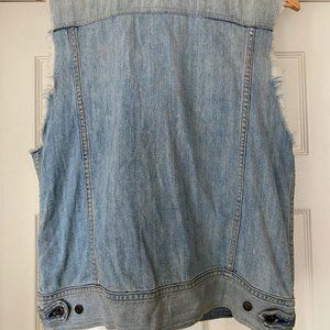 Frayed, cutoff sleeves and collar bring an authentic, well-worn vibe to a 90s style, boyfriend denim vest designed with adjustable button tabs for a customized fit.