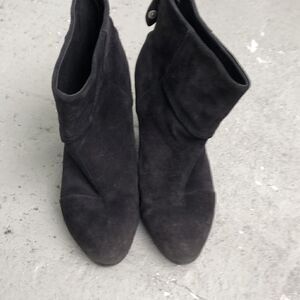 Classic Newberry suede ankle boots not perfect but still good. Need a little bit of cleanup. They have a knick in the back of the heel which I show in pictures. Heel height is 3 inches. Color is like a deep gray or a light black
