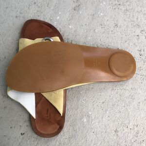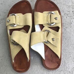 Super cute suede slides. Metal is in great condition. Slight discoloration on the foot bed. It doesn’t show when you’re wearing.