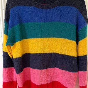 Rainbow-striped knit sweater with navy hem. A lighter knit, great for layering a white collared shirt underneath or wearing on its own.