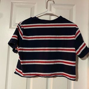 red and white stripped navy back brandy cropped shirt, thick material, lose fit, dm me before purchase you won’t be refunded if you don’t.