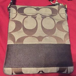 Light and dark brown coach cross body purse and decent shape. There is some discoloration, but will probably come out with some TLC.
