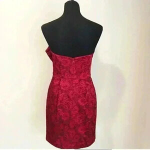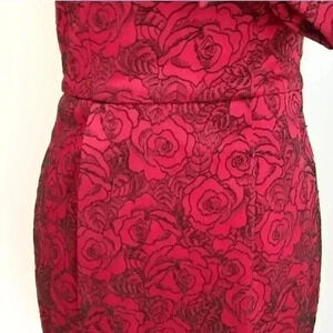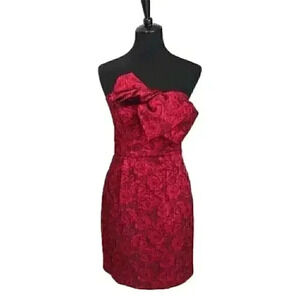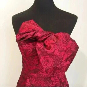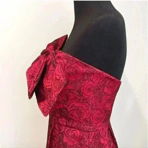 red and black jacquard rose strapless fitted Cocktail bow accent Dress Red NWT