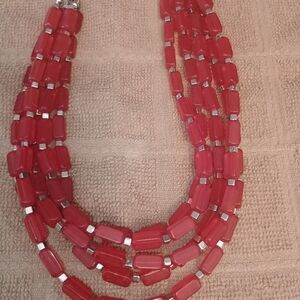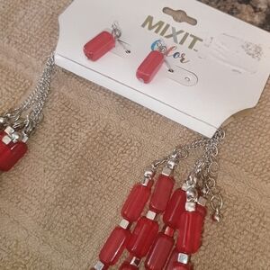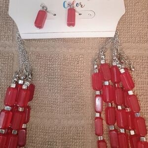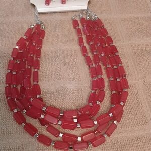 Gorgeous jewelry set. This is a beautiful red and silver earring and necklace set. Mix it color brand. Necklace features a 2in extender for comfortable wear.. red and silver multi-beaded necklace with earrings .Chain link necklace. Beautiful double strand necklace Lays beautifully across the chest. Brand new with tags.