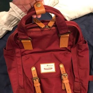 maroon/red backpack with cute strap details and small zipper inserts for storing small items. It fit my Mac laptop and multiple books. Not super big so be cautious but definitely works if you only need it to carry your laptop and textbooks. Great condition, all zippers work, no rips.
