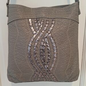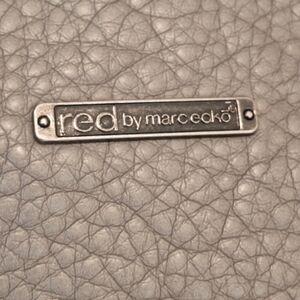 Gray faux leather red by Marc Ecko shoulder/crossbody bag. Silver weaved embellishments on the front. Top zipper close. Inside red lining. Zipper and slip pockets.