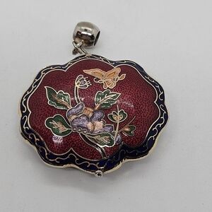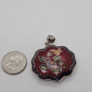 Large cloisonne pendant with flowers and a butterfly on it. Red background, blue border, silver tone metal bail, but the borders of the pendant are more of a gold color. In good used condition. Quarter shown for scale, will not be included with your order.