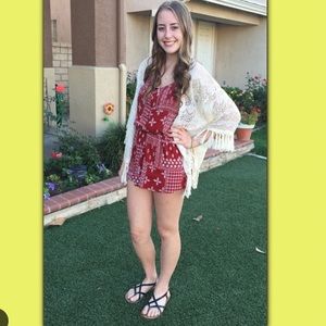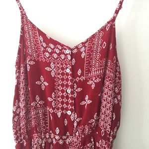 this is a gorgeous red / tan pattern romper! it is so comfortable and great for spring and summer! in great condition no tag attached but it's a size medium