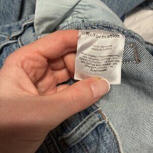 The product is a pair of Reformation Maya Blue high rise skinny jeans in size 24. These denim jeans feature a button fly closure and are designed for women in a regular fit. The blue color and skinny style make them a versatile and trendy addition to any wardrobe.