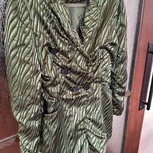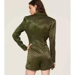 Green and black jacquard (100% Polyester), lining (95% Polyester, 5% Spandex). Romper. Collared neckline. Long sleeves. Front button closure. 32" from shoulder to hemline. Imported.