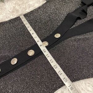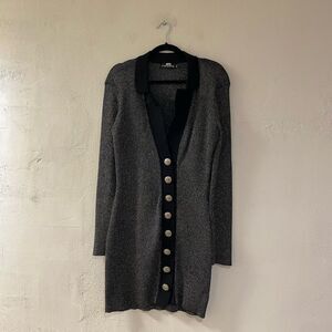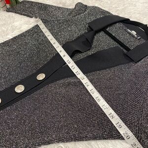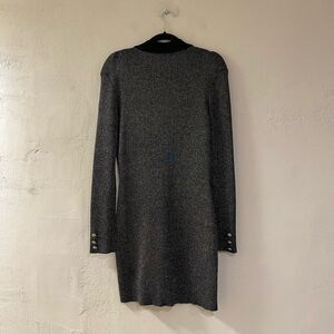 SO STUNNING and in excellent preowned condition! The Mimi Dress is a ribbed knit take on the classic blazer dress. This shimmery mini dress features a body-hugging fit, deep neckline, and asymmetric gold branded button detail. Shown here in Metallic Black/Silver. 92% Cotton, 8% Cashmere.