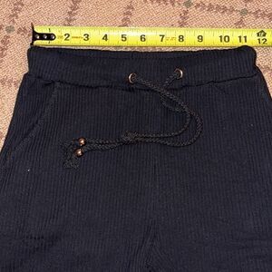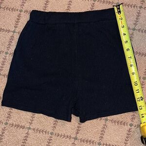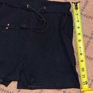 Black ribbed jersey shorts w elastic waist and drawstring ties w gold grommets and gold detail on end of ties. Excellent condition and no rips stains or tears.