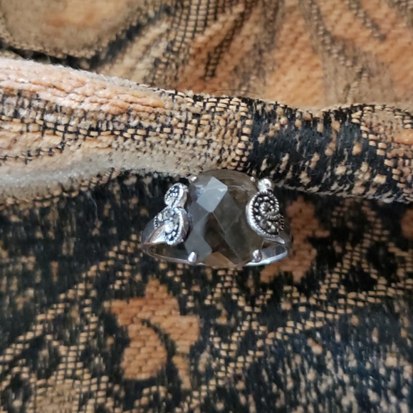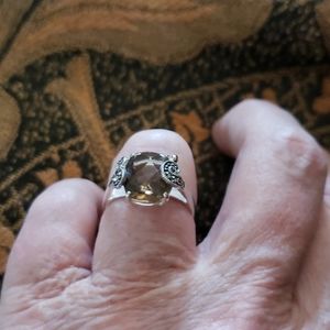 Elegant bezeled topaz and marasite w/a sterling silver ring, not marked 9.25 although, I've worn it on special occasions for a year. Unique design. Size 7 aprox. awesome condition.