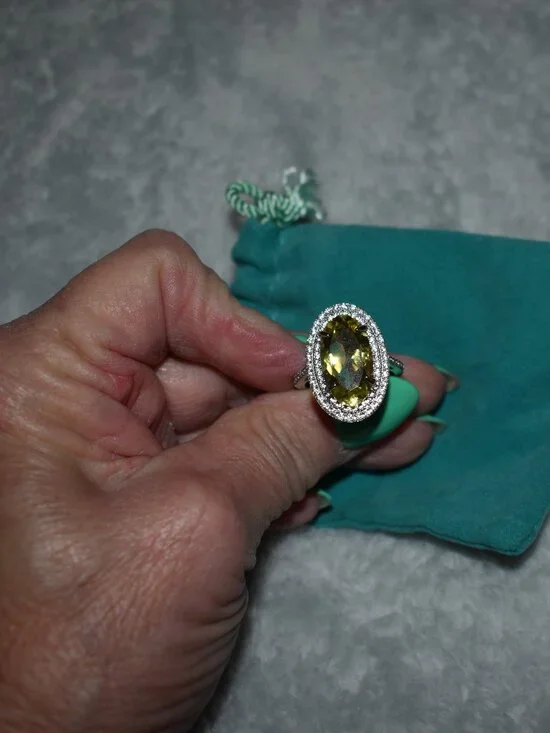 This is a pretty costume ring that has a huge yellow gem that is surrounded by diamond like gems. The band is silver and I wear a size 8 and it fits me perfectly. It was a gift but it is not really me so it has never been worn. Think Princess Diana.
