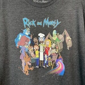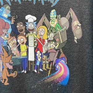 Ripple Junction Rick And Morty Adult Swim Tee shirt Men's Size L Heather Gray. Dark heather gray short sleeve tee shirt with Rick and Morty cast graphic tee shirt. Machine wash, tumble dry low.2018 Cartoon Network. 50% cotton, 50% polyester. In good, pre-owned condition with some stitching irregularities in the bottom hem in the back. It is fully intact, the stitching is just not as straight as on the rest of the shirt. Please see photos in red. Measurements taken flat: pit to pit unstretched: 22", stretched: 25", sleeve length: 8.5", shoulder to hem length: 29". T-Shirt.